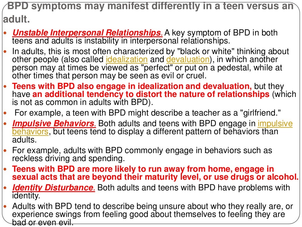 Borderline Symptoms - Borderline Personality Disorder - BPD Causes, Symptoms ... : Borderline pathology in children refers to a syndrome characterized by a combination of externalizing symptoms (disruptive behavioral problems), internalizing symptoms (mood and anxiety symptoms), and cognitive symptoms.. Borderline personality disorder in children and adolescents. University of houston the menninger clinic. Borderline pathology in children refers to a syndrome characterized by a combination of externalizing symptoms (disruptive behavioral problems), internalizing symptoms (mood and anxiety symptoms), and cognitive symptoms. An intense fear of abandonment, even going to extreme measures to avoid real or imagined separation or rejection. Bpd is a condition of.